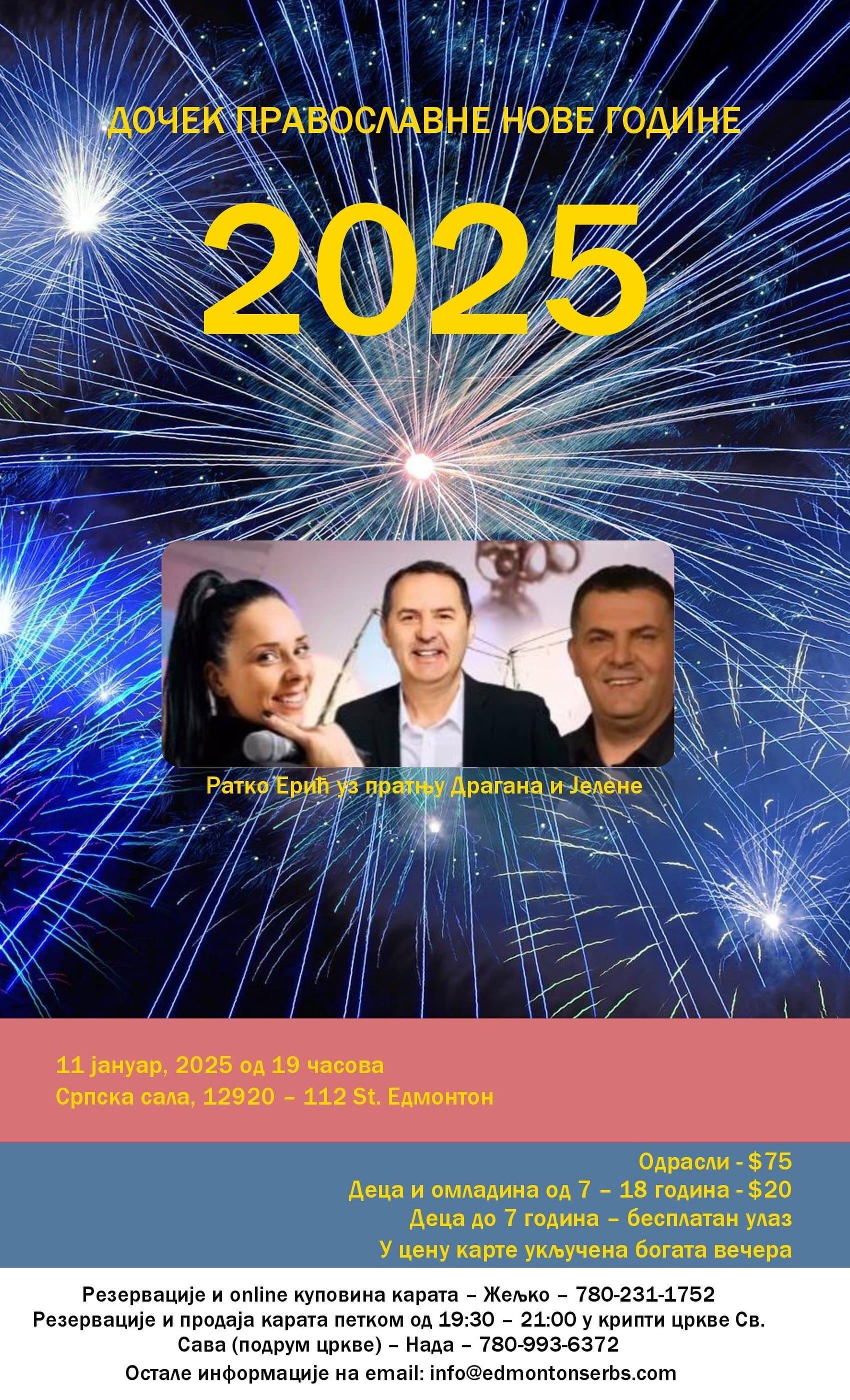 Admin Jan 12, 2025. Позивамо вас на новогодишњу забаву 11. јануара, 2025 од 19 часова Српски Центар Св. Сава - 12920-112 Street, Edmonton Events