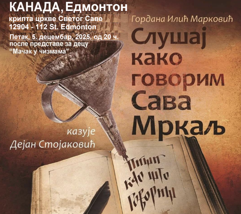 Монодрама "Слушај како говорим, Сава Мркаљ“ у Едмонтону, 5.дец 2025, у 20 ч. у крипти Цркве Св. Саве.